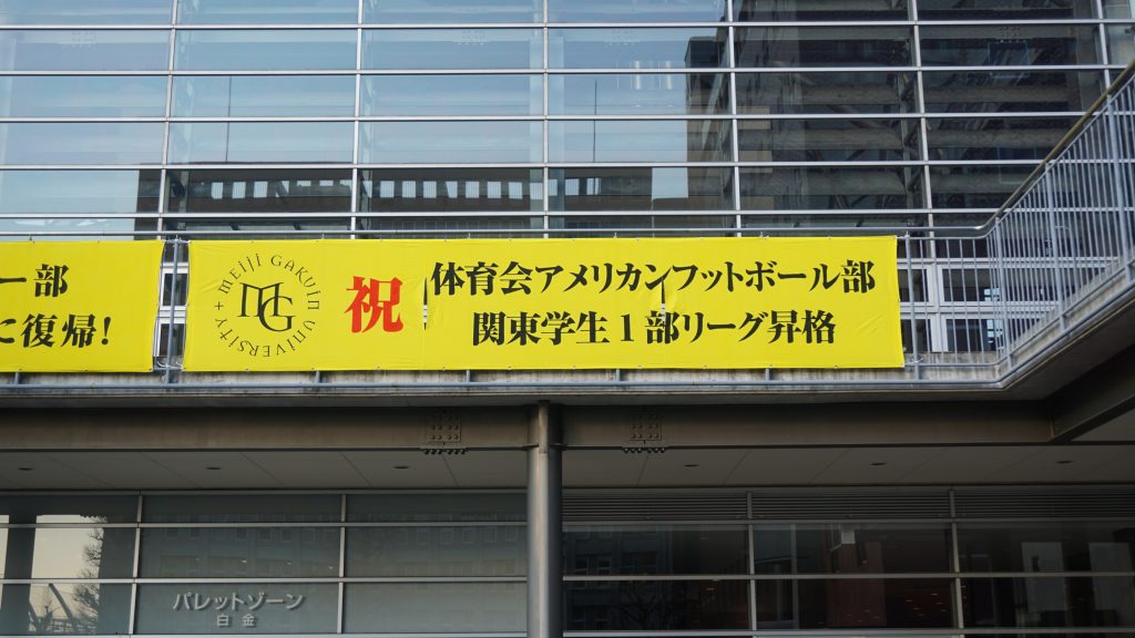 関東1部リーグに昇格したアメリカンフットボール部の活躍を祝い、横断幕が1月15日(水)に白金、横浜両校舎に設置されました。