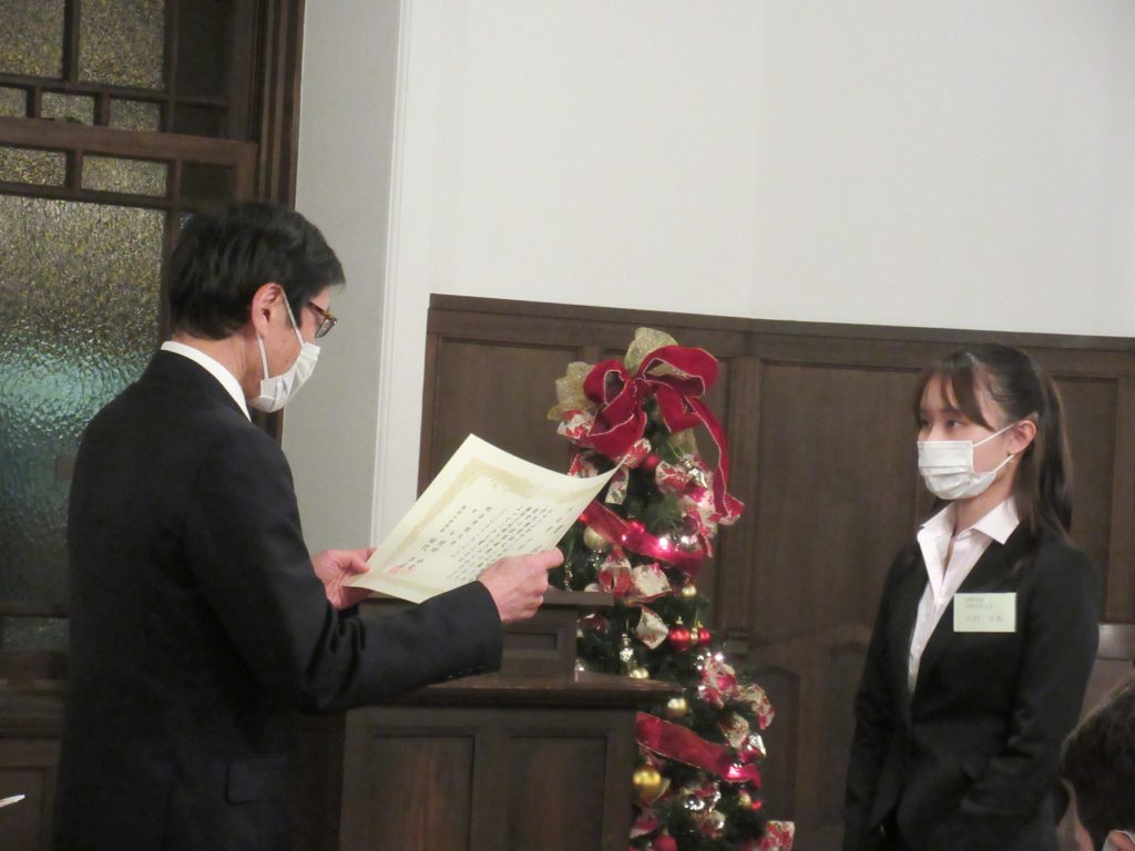 式では、学長、保証人会会長・副会長、学生部長より表彰があり、その後に和気審査委員長(社会学部社会福祉学科教授)から受賞作品に対する講評をいただきました。